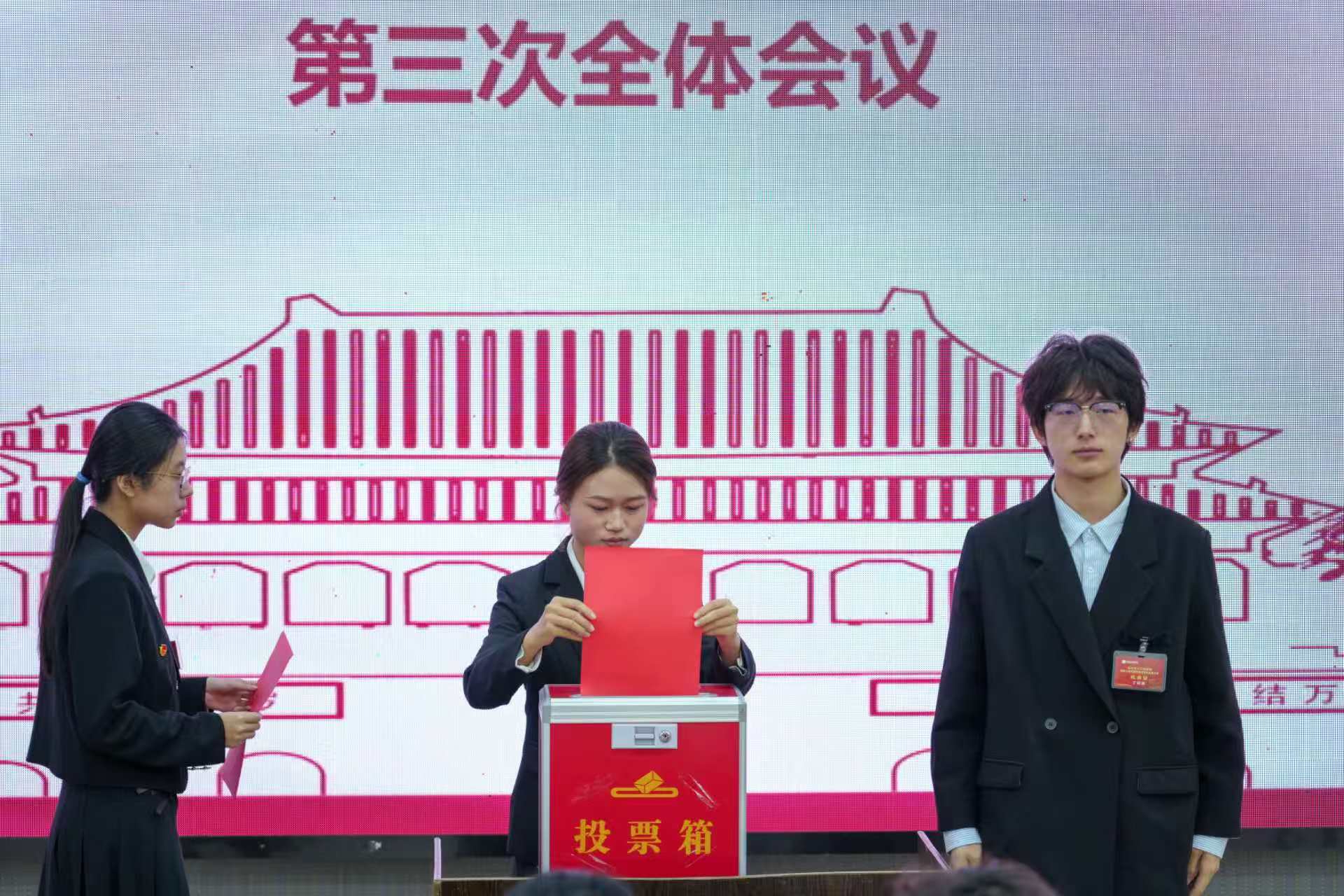 第三次全体会议严格按照程序,依次表决通过了《学生会章程》《大会表决办法》《大会选举办法》、监票人与计票人名单以及第四届学生会主席团成员候选人名单。在随后庄严的选举环节中,与会代表认真履行职责,投下神圣选票,选举产生了新一届学生会主席团成员,充分体现了民主、公正、透明的选举原则。