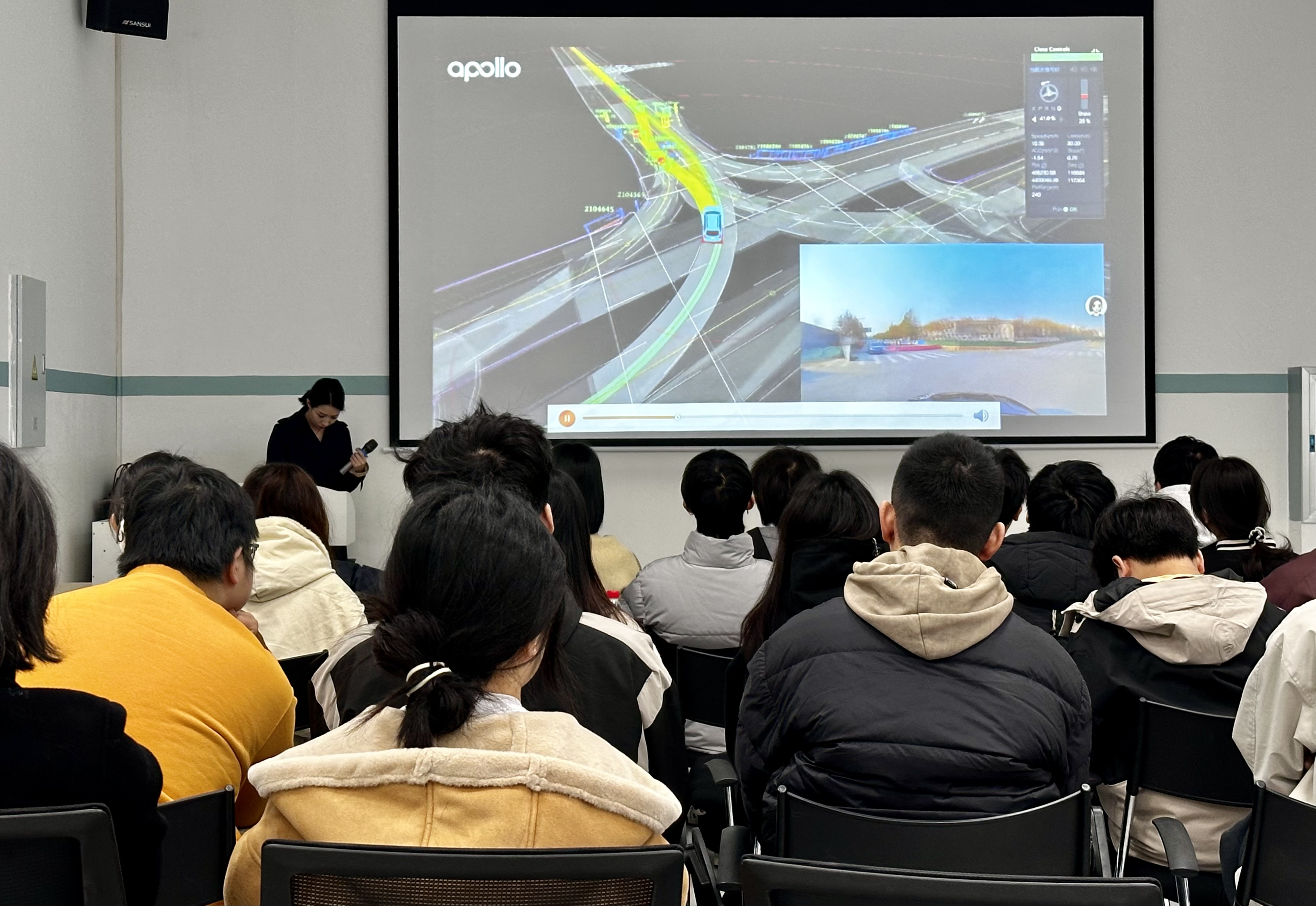 从企业技术专家的专业讲座,到智行谷展厅的沉浸式参观,再到萝卜快跑自动驾驶车的亲身体验,同学们一步步揭开自动驾驶技术的神秘面纱。技术讲座上,专家结合量产落地案例,拆解了自动驾驶从L2辅助驾驶到L4高阶自动驾驶的迭代逻辑,详解了算法优化、数据训练中的行业痛点。